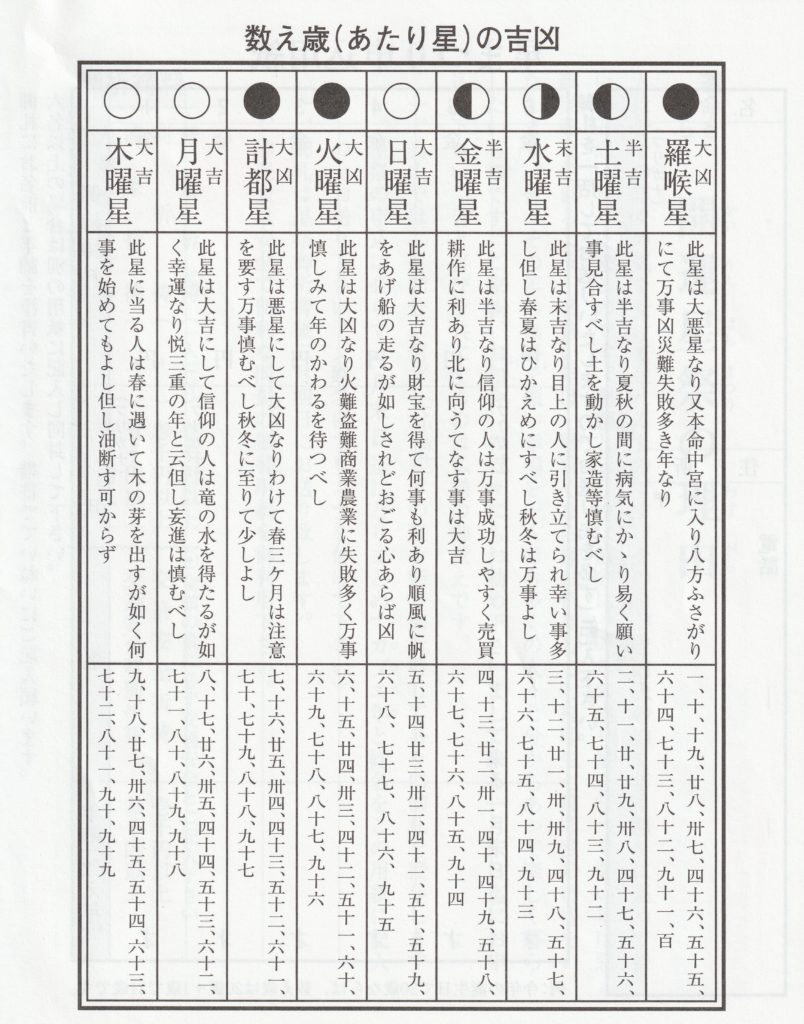 上記の早見表から数え年がわかったら、こちらの吉凶表の下欄から自分の年齢を探します。今年のあなたの吉凶はどれでしたか?