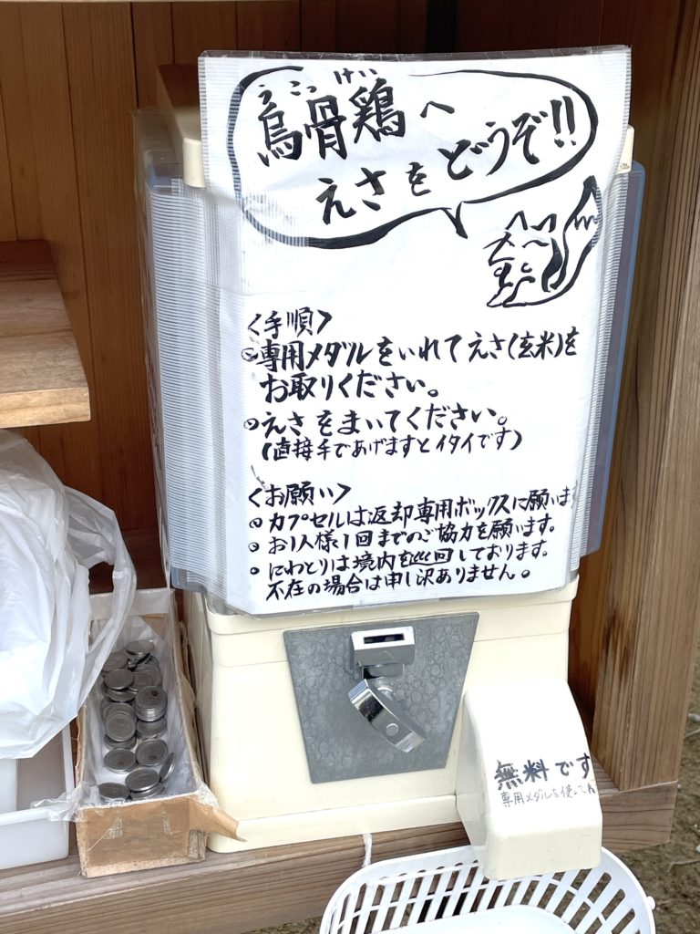 烏骨鶏のエサが入っているガチャです。お金を入れるのではなく、左下にある専用メダルを入れてハンドルを回すとエサが出てきます。